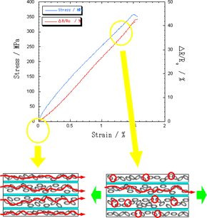 通常のFRP(ガラス繊維強化プラスチックス)のプラスチックス中に炭素粒子を分散させたものです。この材料は、炭素粒子間の電気的な接触構造(パーコレーション構造)により、低ひずみ領域(<約50μstrain)から抵抗値の変化を示します。ガラス繊維の破断伸びまで線形的な抵抗変化が得られるため、広いひずみ範囲における診断が可能です(図3)。主な特性としては、