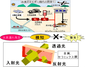 すなわち、漏電、短絡による発熱、着火が起こりえず、またレーザー光の利用により遠隔検知が可能となります。石油系燃料に代わるきれいなエネルギー源として水素が注目され、水素をエネルギー媒体として利用する新たなエネルギーシステムが検討されています。燃料として水素ガスを搭載した自動車や水素を燃料とした燃料電池の開発、水素スタンドの設置など、水素エネルギー時代がすぐそこまで来ています。一方、水素は色も匂いもありません。水素漏れが起きても、人間の五感では感知することが出来ません。水素エネルギー時代の到来に伴い、より安全で快適な生活を送るためには、水素ガスを安全、確実に検知するセンサーの開発が不可欠となるのです。