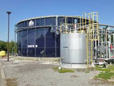 液肥貯留タンク(黒)、手前は加熱殺菌槽 |