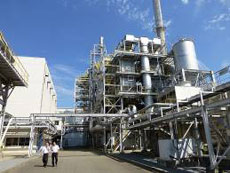 木質チップ燃料(専焼)の発電所。流動床ボイラ+蒸気タービンで12MWの発電出力を持ち、所内動力を除いた約10MWを電力会社へ売電しています。