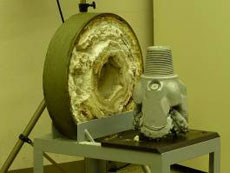 スケールのついた配管断面模型と掘削ビット |