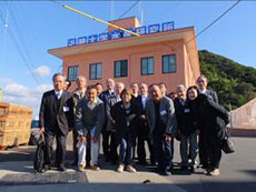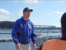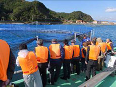 全員、この日のために前日から串本に宿泊し、朝10時から漁船に乗って近畿大学のクロマグロ養殖生簀を見学させていただきました。事業場長でもある岡田特命教授に同乗していただき丁寧な説明を受け、沖出ししたばかりの若魚から10年目の親魚まで見ることができました。特に、親クロマグロがゆうゆうと泳ぐ姿には命の荘厳さを感じました。また、岡田教授の丁寧なリアルなご説明には養殖への並々ならぬ熱意を感じました。
