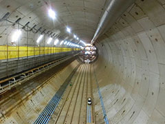 また、シールドマシンで掘削した大量の土砂(1m掘り進むと学校のプール1杯分)を、供用中の外環道内に設置するベルトコンベヤを使って、和光市の仮置き場まで搬送します。その延長は約6kmにもおよび、土砂搬出の作業にトラックを使用せず、交通渋滞を緩和して、環境に配慮した工事を行っています。